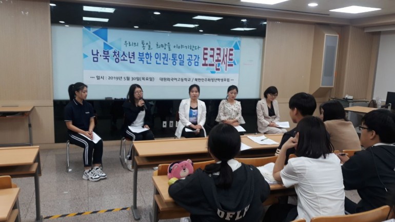 북한민주화청년학생포럼(대표 : 박광일)은 지난 2019년 5월 30일(목요일), 서울 대원외국어고등학교에서 2019 남,북 청소년 북한 인권,통일 공감 토크콘서트를 진행하였습니다. 70명 이상의 고등 학생들이 참가한 가운데 '우리의 통일. 희망을 이야기한다'라는 주제로 진행된 남,북 청소년 북한 인권,통일 공감 토크콘서트에서는 미래 통일시대의 주인공들인 우리 청소년들의 통일에 대한 생각을 솔직 담백하게 나누는 통일 공감의 장이었습니다. 북한민주화청년학생포럼은 앞으로도 남,북 청소년 북한 인권,통일 공감 토크콘서트를 확대시켜 통일시대를 위한 청소년 의식증진활동에 이바지하려 합니다