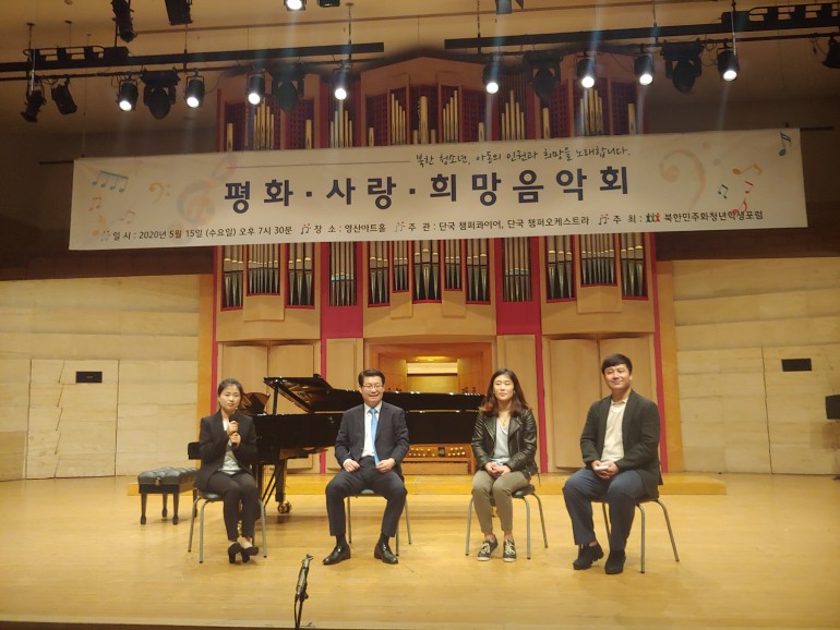 북한민주화청년학생포럼(대표 : 박광일)이 주최하고 단국대학교 음악대학 학생들이 주관한 단국챔프콰이어, 오케스트라(지휘자 : 윤한) 주관의 평화, 사랑, 희망음악회가 지난 2020년 5월 15일(금요일) 서울특별시 여의도 영산아트홀에서 개최되었습니다. 이번 평화, 사랑, 희망음악회는 '북한 청소년(아동)의 인권과 희망을 노래한다'는 주제로 비발디의 '조국의 영광을 노래한다'와 그리운 금강산, 아리랑 등의 합창으로 남,북의 평화를 노래한다' 등으로 진행되었습니다. 희망음악회 1부에서는 북한 탈북 출신의 대학생들이 북한 청소년, 아동에게 희망을 전하기 위한 토크콘서트를 진행하였습니다.