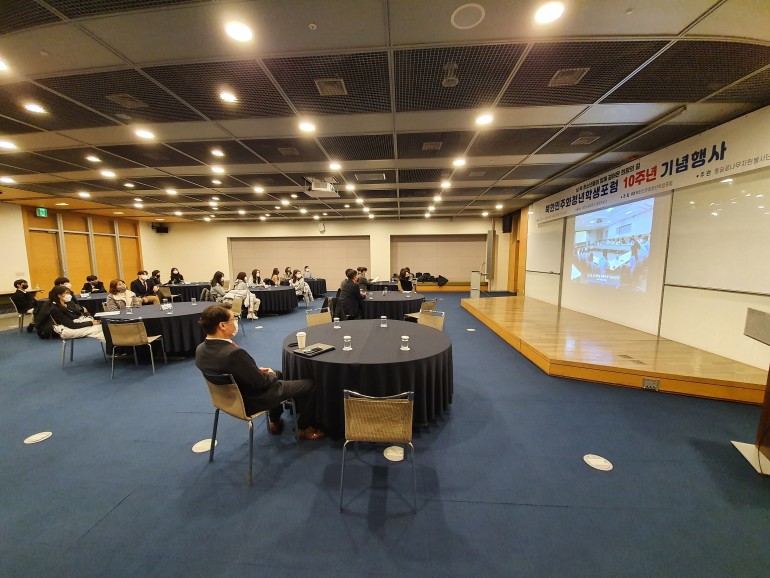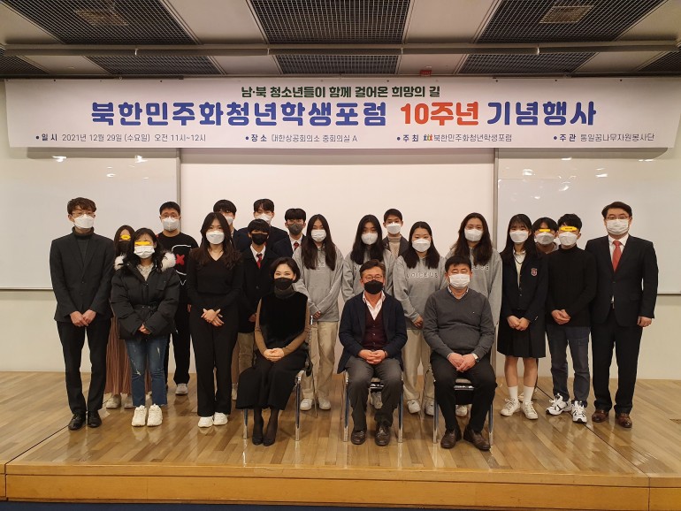 북한민주화청년학생포럼(대표 : 박광일) 설립 10주년 기념행사가 지난 2021년 12월 29일(수요일), 대한상공회의소 중회실에서 '남,북 청소년이 함께 걸어온 희망의 10년'이라는 주제로 진행되었습니다. 개회식과 토크콘서트 동아리 입단식 등 다양한 순서로 행사는 진행되었습니다.