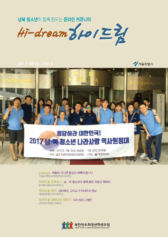 북한민주화청년학생포럼(대표 : 박광일)은 서울특별시가 지원하는 2017 비영리민간단체 공익지원사업으로 남,북 청소년들이 함께 만드는 하이드림 잡지 2017년 제3호를 발간하게 되었습니다.