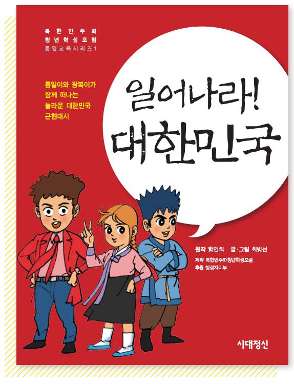 북한민주화청년학생포럼(대표 : 박광일)은 행정자치부가 지원하는 2015년 비영리민간단체 공익지원사업으로 청소년 통일교육자료집 1부 '일어나라 대한민국'을 발간하였습니다. '일어나라 대한민국'은 통일이와 광복이라는 두 캐릭터가 대한민국의 근대사를 돌아보는 과정을 애니메이션북으로 제작함으로 우리 청소년들이 대한민국의 자랑찬 근대사를 배우고 미래 통일에 대한 새로운 비전을 가지도록 교육하는 귀중한 통일교육에 필요한 교재으로 쓰이게 될 것입니다.