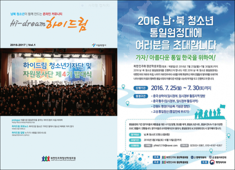 북한민주화청년학생포럼(대표 : 박광일)은 서울특별시가 지원하는 2016 비영리민간단체 공익지원사업으로 남,북 청소년들이 함께 만드는 하이드림 잡지 2017년 제1호를 발간하게 되었습니다.