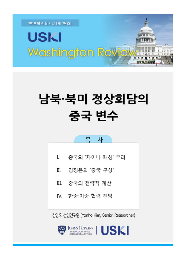최근 미국 존스홈스킨대학 김연호 선임연구위원께서는 남,북-북,미 정상회담에서 중국의 변수에 대한 논문발표를 하였습니다. 관련 자료를 첨부파일로 올립니다.