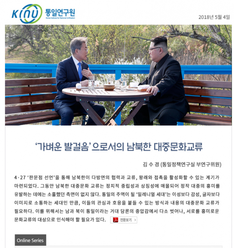 지난 2018년 4·27 ‘판문점 선언’을 통해 남,북한이 다방면의 협력과 교류, 왕래와 접촉을 활성화할 수 있는 계기가 마련되었습니다. 그동안 남,북한 대중문화 교류는 정치적 중립성과 상징성에 매몰되어 정작 대중의 흥미를 유발하는 데에는 소홀했던 측면이 없지 않습니다. 통일의 주역이 될 ‘밀레니얼 세대’는 이성보다 감성, 글자보다 이미지로 소통하는 세대인 만큼, 이들의 관심과 호응을 붙들 수 있는 방식과 내용의 대중문화 교류가 절실히 필요합니다. 이를 위해서는 남과 북이 통일이라는 거대 담론의 중압감에서 다소 벗어나, 서로를 흥미로운 문화교류의 대상으로 인식해야 할 필요가 있습니다. 이에 통일연구원에서는 다가오는 통일시대를 위한 분위기 조성으로 남,북한 대중문화교류를 위한 방법론을 발표하였습니다. 이에 통일연구원 발표자료를 첨부파일로 올립니다.