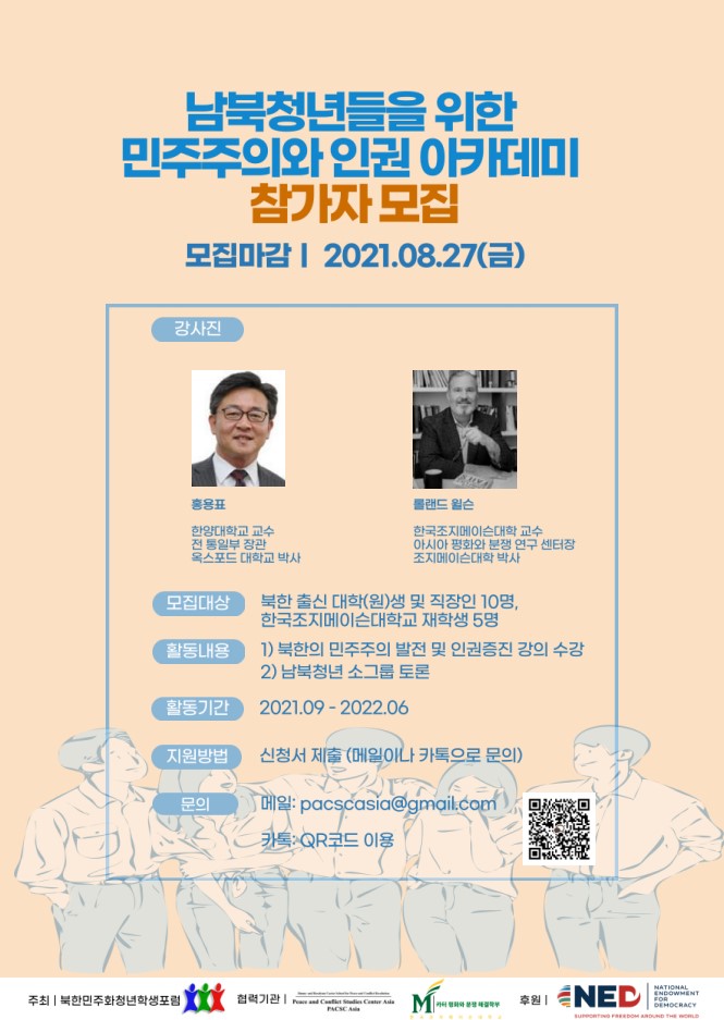 북한민주화청년학생포럼(대표 : 박광일)은 미국 국립민주주의진흥재단(National Endowment for Democracy)의 지원으로 북한사회의 민주주의 실현과 인권증진을 위한 남,북 청년대학생 리더십아카데미를 미국 조지메이슨대학 한국캠퍼스 아시아평화분쟁연구센터(George Mason University Korea PACSC Asia Center)와 함께 개최하오니 많은 참여 부탁드립니다.