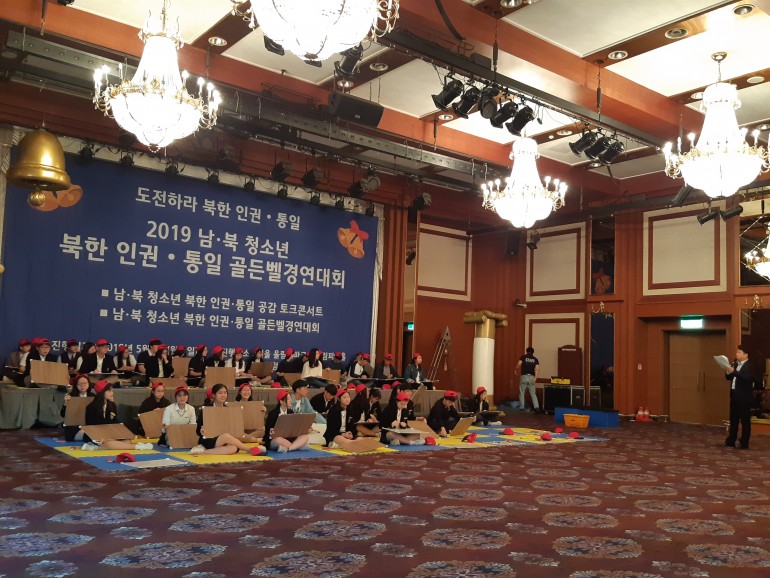 북한민주화청년학생포럼(대표 : 박광일)은 지난 2019년 5월 6일(월요일), 서울시 송파구 올림픽파크텔 올림피아홀에서 서울시와 수도권지역의 고등학생 250여명이 참가한 가운데 2019 남,북 청소년 북한 인권,통일 공감 골든벨경연대회를 개최하였습니다. 본 사진은 2부 순서로 진행된 남,북 청소년 북안 인권,통일 공감 골든벨연연대회 진행 사진입니다.