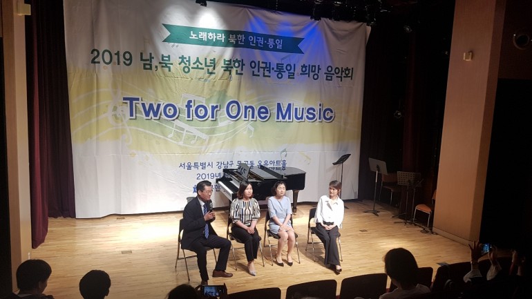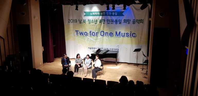 북한민주화청년학생포럼(대표 : 박광일)은 지난 2019년 5월 18일(토요일), 서울시 강남구 도곡2문화센터 오유아트홀에서 2019 남,북 청소년 북한 인권,통일 희망음악회를 개최하였습니다. 이번 희망음악회는 남,북 청소년 예술연합 동아리인 '투포원뮤직'의 주관으로 국악고등학교, 선화예술고등학교, 중앙대학교 사범대학 부속 고등학교, 영동고등학교, 대원외국어고등학교, 청담고등학교 등 서울시내 고등학교 학생들이 참가하였습니다. '노래하라 북한 인권,통일'을 주제로 진행된 이번 희망음악회에서 진행된 토크콘서트 모습입니다.