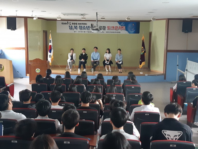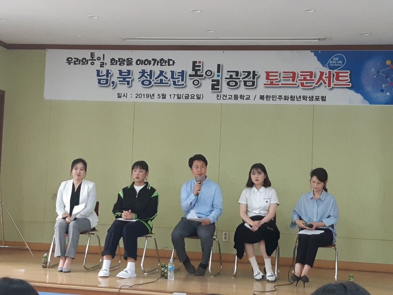 북한민주화청년학생포럼(대표 : 박광일)은 지난 2019년 5월 17일(금요일), 경기도 남양주시 진건고등학교에서 2019 남,북 청소년 북한 인권,통일 공감 토크콘서트를 진행하였습니다. 150명 이상의 고등 학생들이 참가한 가운데 '우리의 통일. 희망을 이야기한다'라는 주제로 진행된 남,북 청소년 북한 인권,통일 공감 토크콘서트에서는 미래 통일시대의 주인공들인 우리 청소년들의 통일에 대한 생각을 솔직 담백하게 나누는 통일 공감의 장이었습니다. 북한민주화청년학생포럼은 앞으로도 남,북 청소년 북한 인권,통일 공감 토크콘서트를 확대시켜 통일시대를 위한 청소년 의식증진활동에 이바지하려 합니다.