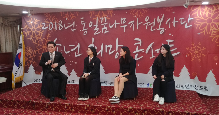 북한민주화청년학생포럼(대표 : 박광일)은 지난 2018년 12월 29일(토요일), 서울특별시 송파구 올림픽파크텔 서울홀(2층)에서 2018년 통일꿈나무자원봉사단 송년 희망 콘서트를 개최하였습니다. 2018년 통일꿈나무자원봉사단 송년 희망 콘서트에는 대원외국어고등학교 봉사동아리 투포원, 선화예술고등학교 봉사동아리 통일꿈나무 선화예고 봉사단, 서울국제학교(Seoul International School) 봉사동아리 NSCULB, 청소년 예술연합동아리 투포원뮤직 학생들과 학부모님들이 참여하였습니다. 2018년 통일꿈나무자원봉사단 송년 희망 콘서트에서는 각 고등학교 동아리 대표들을 모시고 자원봉사 희망 콘서트를 진행하였습니다.