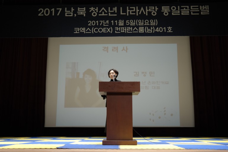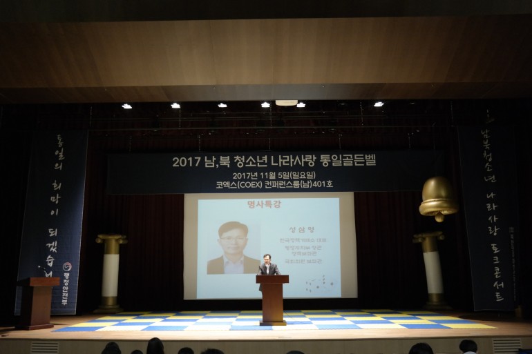 북한민주화청년학생포럼(대표 : 박광일)은 행정안전부가 지원하는 2017년 비영리민간단체 공익지원사업으로 2017 남,북 청소년 나라사랑 통일 골든벨경연대회를 2017년 11월 5일(일요일), 서울시 코엑스(COEX) 컨퍼런스룸(남) 401호에서 개최하였습니다. 2017 남,북 청소년 나라사랑 통일 골든벨 경연대회 격려사, 명사특강이 진행되는 모습을 사진에 담았습니다. 이번 행사 격려사는 남,북 청소년 통일자원봉사단인 하이드림 김정민 운영위원장님께서 해주셨습니다. 명사특강은 성삼영 한국정책거래소 대표님께서 해주셨습니다.