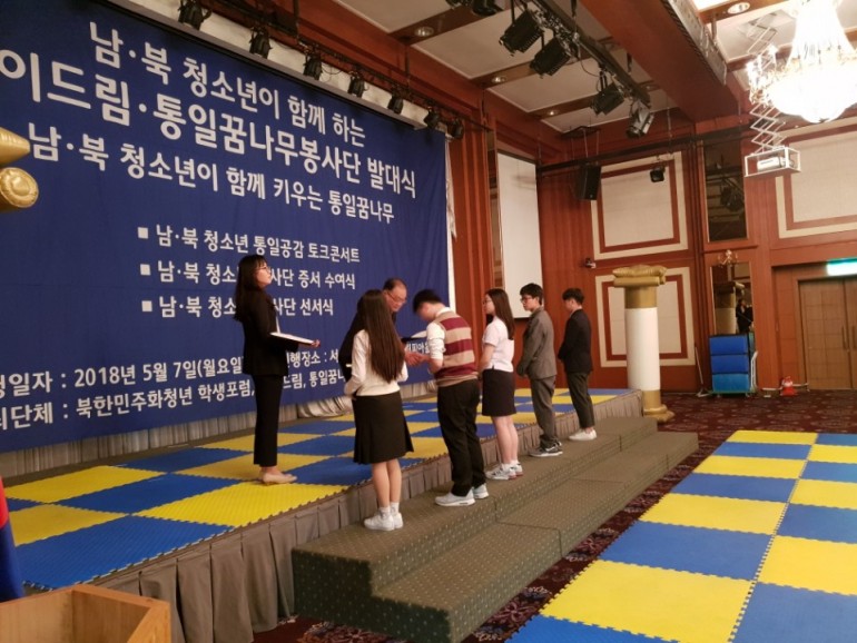 북한민주화청년학생포럼(대표 : 박광일)은 지난 2018년 5월 7일(월요일), 서울특별시 송파구 올림픽파크텔에서 남,북 청소년 통일꿈나무봉사단 발대식을 진행하였습니다. 이번 남,북 청소년 통일꿈나무봉사단 발대식에서는 봉사단 단원들에게 통일꿈나무봉사단 단원 증서 수여식과 단원선서식이 진행되었습니다.