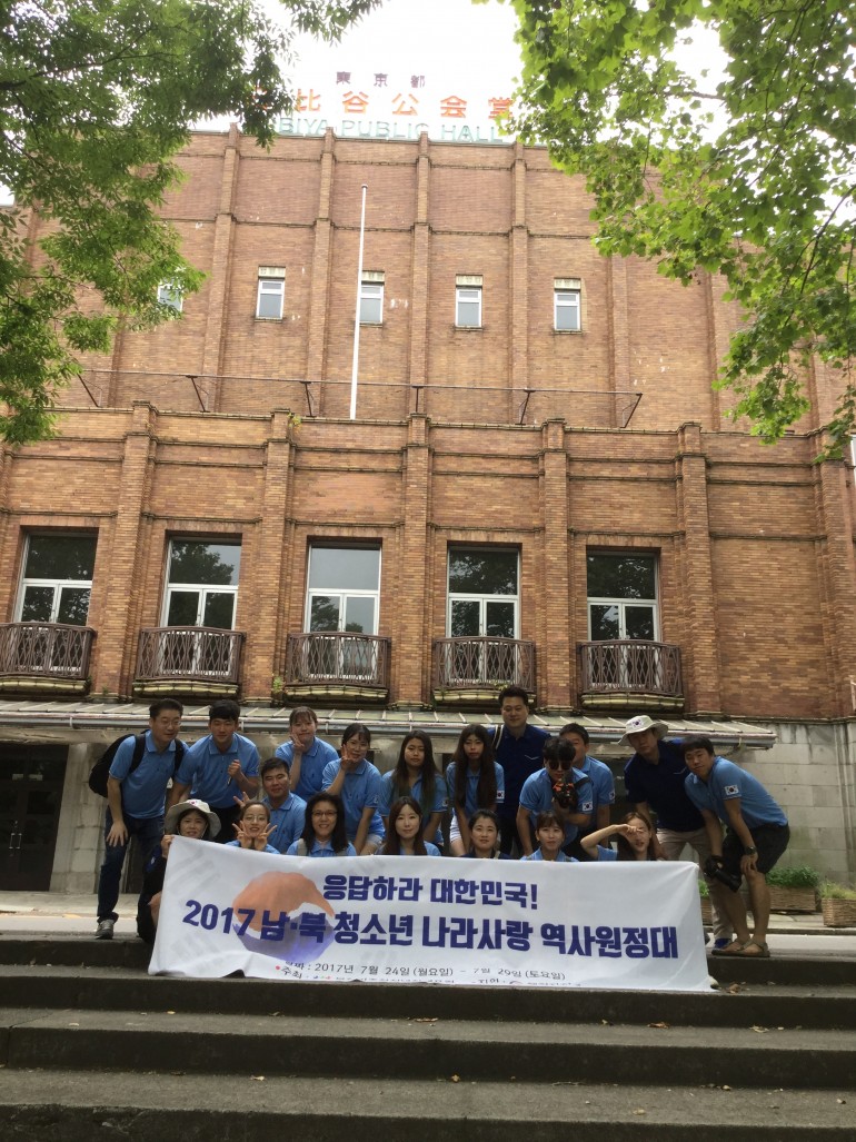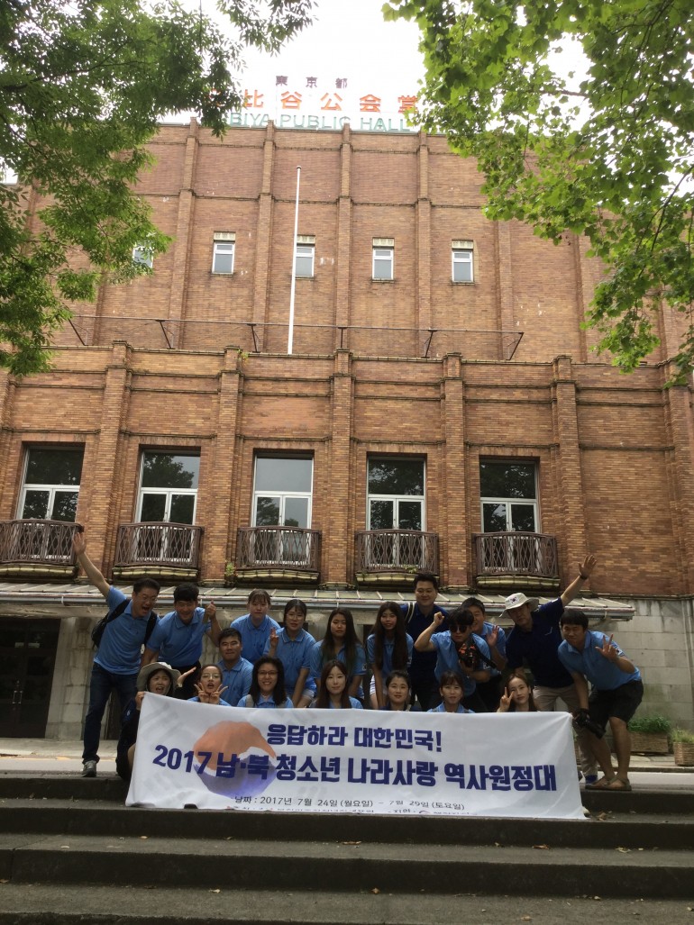 북한민주화청년학생포럼(대표 : 박광일)이 2017년 행정자치부 비영리민간단체 공익지원사업으로 조직한 남,북 청소년 나라사랑역사원정대는 지난 2017년 7월 25일(화요일), 오전 일본 도쿄시내에 위치한 히비야공원을 탐방하였습니다. 히비야공원은 지난 1919년 2월 8일, 일본에서 유학중이던 대한민국 유학생들이 일어나 대한민국의 독립을 요구하며 독립만세를 외친 곳입니다. 이번 남,북 청소년 나라사랑역사원정대는 2.8독립만세가 외쳤던 히비야공원을 탐방하고 대한민국의 독립을 위하여 투쟁한 독립선열들의 숭고한 업적을 배우는 시간을 가졌습니다.