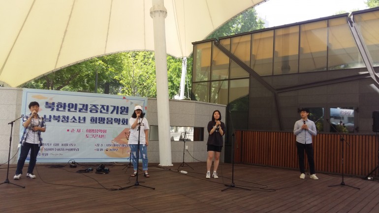 북한민주화청년학생포럼(대표 : 박광일)은 투포원과 함께 2017년 6월 10일(통일), 서울 대학로 마로니에공연 야외공연장에서 '통일의 빛, 희망의 빛이 되겠습니다'라는 주제로 북한인권증진기원 남,북 청소년 희마음악회롤 개최했습니다. 이번 희망음악회는 20개 서울시내 고등학교 예술동아리가 참가하여 북한인권증진을 기원하는 마음으로 희망음악회를 개최하였습니다.