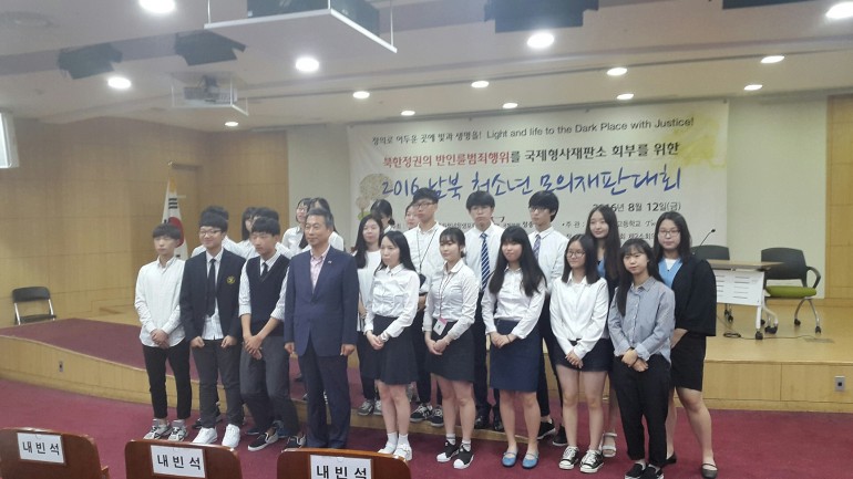 북한민주화청년학생포럼(대표 : 박광일)과 국회의원 정종섭 의원실이 공동주최한 2016년 북한정권의 반인도번죄행위를 국제형사재판소(International Criminal Court · ICC) 제소를 위한 2016년 남,북 청소년 모의재판대회가 2016년 8월 12일(금요일), 대한민국 국회 소회의실에서 개최되었습니다. 이번 2016년 남,북 청소년 모의재판대회는 통일부의 협찬과 국회 외교통일위원장, 정무위원회의 지원도 함께 있었습니다. 2016년 남,북 청소년 모의재판대회에서는 1등을 한 대원외국어고등학교 정의팀이 통일부장관상을 수상하였습니다.