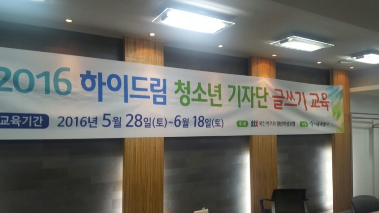 서울특별시 비영리민간단체 공익지원사업으로 북한민주화청년학생포럼(대표 : 박광일)이 주최하고 제4기 하이드림 청소년 기자단이 주관하는 글쓰기 교실 2회 강의가 2016년 6월 4일(토요일), 서울특별시 강남구 소재 토즈 강남2호점에서 진행되였습니다. 하이드림 청소년 기자단 글쓰기교실 2회 강의는 청년시사잡지 '바이트' 이철훈 대표께서 '기사 작성과 글쓰기 기초' 주제로 강의를 해주셨습니다.