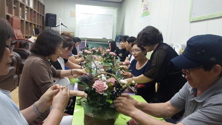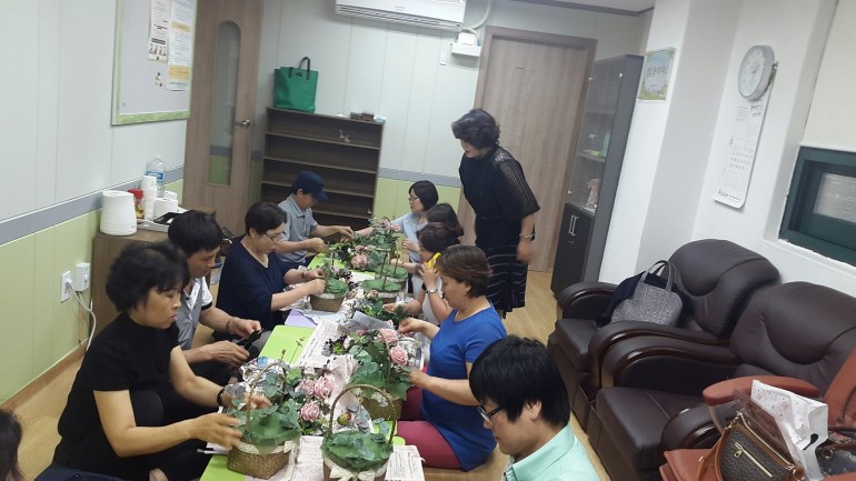 남북하나재단(이사장 : 손광주)이 지원하고 북한민주화청년학생포럼(대표 : 박광일)이 주최한 북한이탈주민 사회정착을 위한 평생학습교실인 '착한동네' 프로그램으로 진행되는 '문화교실' 3회 강의가 2016년 6월 19일(일요일), 서울특별시 송파구 거여동 소재 아름다운꿈의교회에서 진행되었습니다. '문화교실' 3강의는 송은희 리본아트 강사님과 북한이탈주민들이 함께 하는 꽃꽃이 만들기 교육이 진행되었습니다. 이번 문화교실 3강의에는 서울특별시 송파구 거여동 거주 북한이탈주민 20여명이 참가하여 꽃꽃이를 만들어보는 귀한 시간을 가졌습니다.
