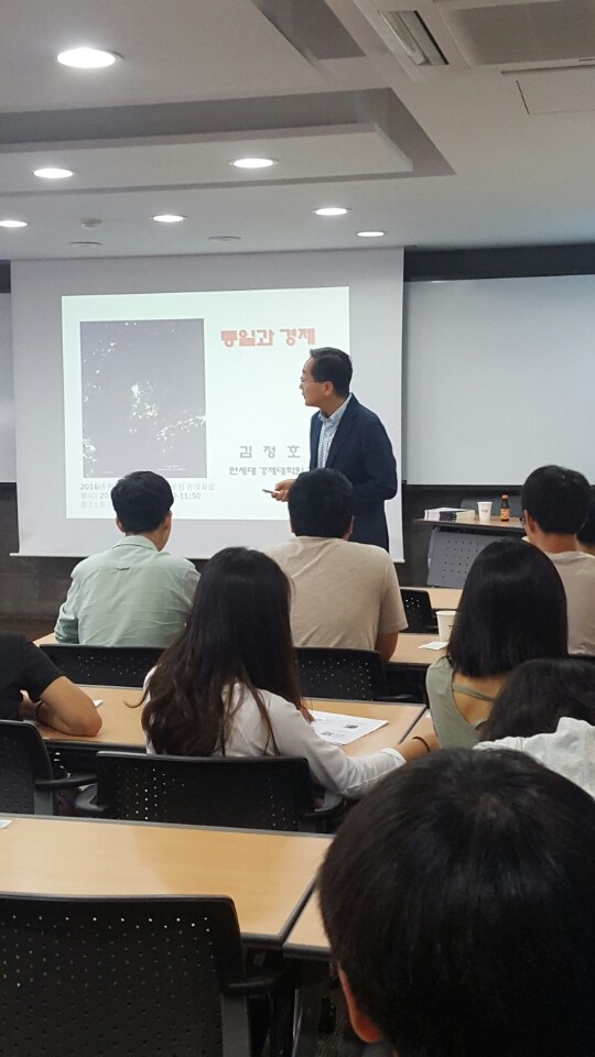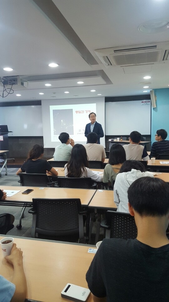 행정자치부가 지원하는 2016년 비영리민간단체 공익지원사업으로 북한민주화청년학생포럼(대표 : 박광일)이 주최하는 2016년 남,북 청소년 통일아카데미 '준비하는 통일시대' 5회 강의가 2016년 7월 9일(토요일), 서울특별시 강남구 소재 토즈 강남점에서 진행되었습니다. 2016년 남,북 청소년 통일아카데미 5회 강의는 김정호 연세대학교 경제대학원 교수께서 '평화통일과 경제' 주제로 강의를 진행하였습니다.