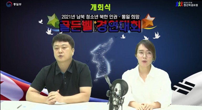 북한민주화청년학생포럼(대표 : 박광일)은 지난 2021년 08월 21일(토요일), 경기도 분당에 있는 메타허브센터에서 '도전하라 북한인권'이라는 슬로건으로 북한 인권증진 및 한반도 통일 남,북 청소년 골든벨경연대회를 온라인진행방식으로 진행했습니다. 이번 남,북 청소년 골든벨경연대회에는 서울시, 수도권 고등학교, 서울국제학교(SIS), 서울외국인학교(SFS) 학생 100여명이 참가했습니다. 이날 골든벨경연대회는 1부 북한민주화청년학생포럼 박광일 대표님의 개회사로 막을 올렸습니다. 2부는 유튜브체널로 전체 골든벨경연대회 참가 학생들을 대상으로 북한 아동, 청소년 인권과 통일 관련 문제 20문제를 제시하고 이 중 제일 많은 문제의 답을 맞춘 10명의 학생이 ZOOM으로 접속5하여 최후 골든벨우숭자가 나올때까지 진행하는 방식으로 결승전이 진행되었습니다. 이번 2021년 북한 인권증진과 한반도 통일 골든벨경연대회 최우숭자는 대원외국어고등학교 1학냔 이예은 학생이 선정되었습니다.