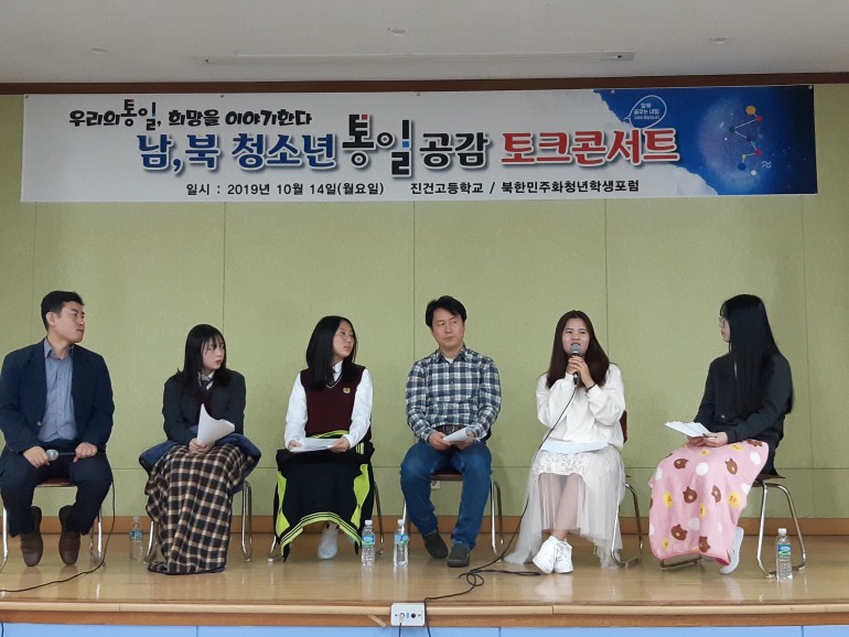 북한민주화청년학생포럼(대표 : 박광일)은 지난 2019년 10월 14일(월요일), 경기도 남양주시 진건고등학교에서 2019년 하반기 남,북 청소년 북한 인권,통일 공감 토크콘서트를 진행하였습니다. 150명 이상의 고등 학생들이 참가한 가운데 '우리의 통일. 희망을 이야기한다'라는 주제로 진행된 남,북 청소년 북한 인권,통일 공감 토크콘서트에서는 미래 통일시대의 주인공들인 우리 청소년들의 통일에 대한 생각을 솔직 담백하게 나누는 통일 공감의 장이었습니다. 북한민주화청년학생포럼은 앞으로도 남,북 청소년 북한 인권,통일 공감 토크콘서트를 확대시켜 통일시대를 위한 청소년 의식증진활동에 이바지하려 합니다.