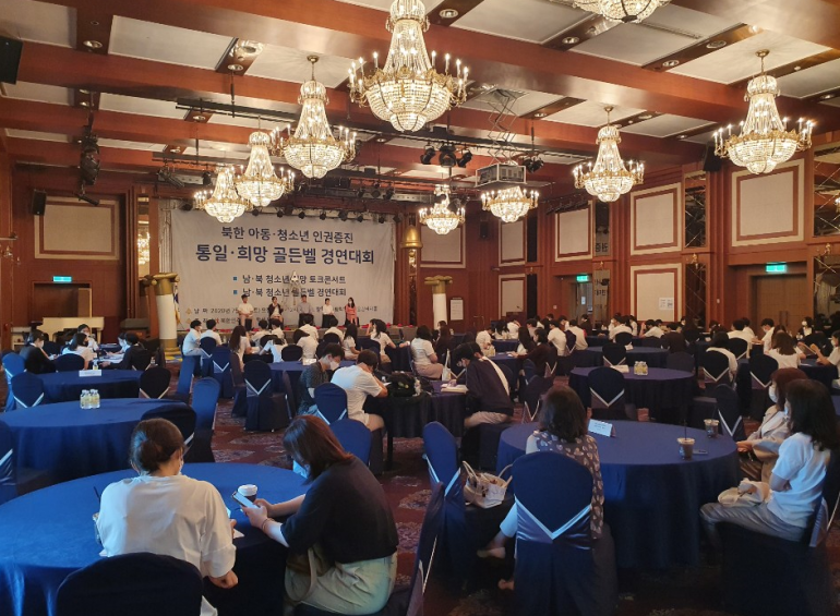 북한민주화청년학생포럼(대표 : 박광일)은 지난 2020년 7월 4일(토요일), 서울시 송파구 올림픽파크텔 올림피아홀에서 2020년 북한 아동, 청소년 인권 및 한반도 통일 남,북 청소년 골든벨경연대회를 개최하였습니다. 이번 골든벨경연대회는 1부 순서로 '북한 아동, 청소년의 삶에서 통일을 찾는다'라는 주제로 남과 북의 청소년들의 토크콘서트가 진행되었습니다.