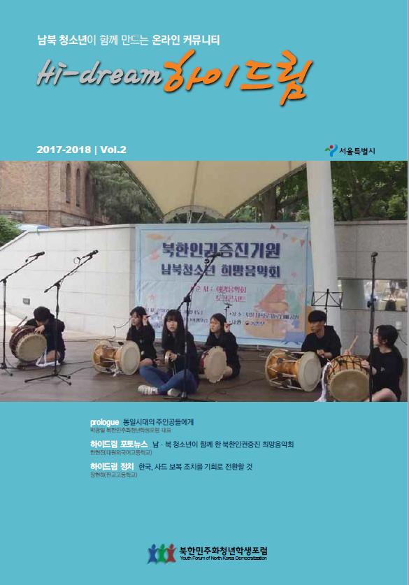 북한민주화청년학생포럼(대표 : 박광일)은 서울특별시가 지원하는 2017 비영리민간단체 공익지원사업으로 남,북 청소년들이 함께 만드는 하이드림 잡지 2017년 제2호를 발간하게 되었습니다.
