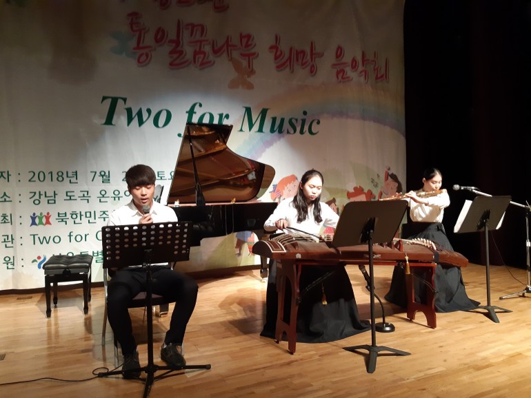 북한민주화청년학생포럼(대표 ; 박광일)은 지난 2018년 7월 21일(토요일), 서울특별시 강남구 도곡2문화센터 오유아트홀에서 남,북 청소년 통일꿈나무 희망 음악회를 개죄하였습니다. 이번 남,북 청소년 통일꿈나무 희망음악회에 참가한 국악고등학교 학생들의 공연모습입니다.