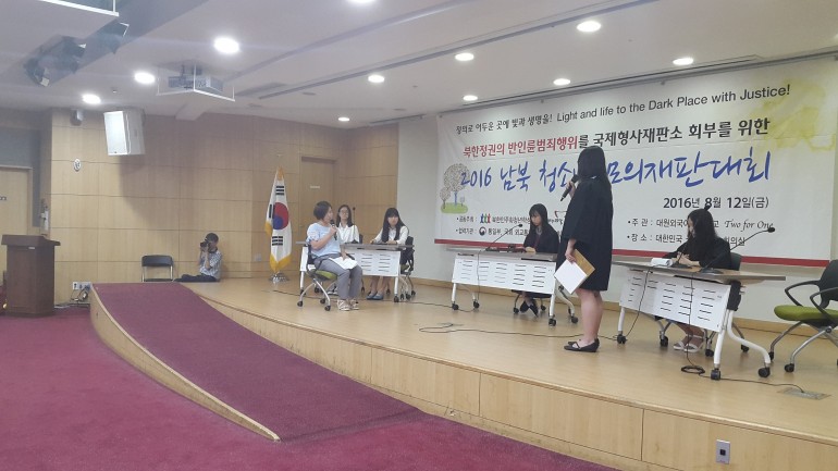북한민주화청년학생포럼(대표 : 박광일)과 국회의원 정종섭 의원실이 공동주최한 2016년 북한정권의 반인도번죄행위를 국제형사재판소(International Criminal Court · ICC) 제소를 위한 2016년 남,북 청소년 모의재판대회가 2016년 8월 12일(금요일), 대한민국 국회 소회의실에서 개최되었습니다. 이번 2016년 남,북 청소년 모의재판대회에서는 1등을 한 대원외국어고등학교 정의팀이 통일부장관상을 수상하였습니다.