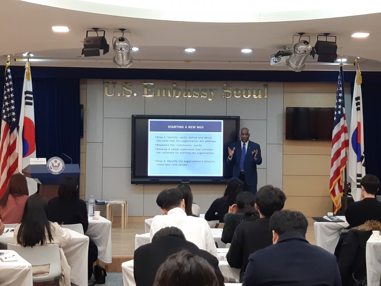 북한민주화청년학생포럼(대표 : 박광일)과 미국 국제공화주의연구소(International Republican Institute : IRI)와 함께 하는 민주주의 리더 펠로우십 아카데미 참가자들이 지난 2019년 11월 9일(토요일), 서울시 용산구에 위치하고 있는 주한 아메리칸 코리아센터를 참관하였습니다. 이날 참가자들은 미국 풀로리다주립대학교 교수인 무루사미 쿠마란(Muthusami Kumaran)박사로부터 비영리민간단체(NGO)의 설립과 운영, 다양한 활동전략에 대한 특강을 듣는 시간을가졌습니다. 민주주의 리더 펠로우십 아카데미는 2020년 3월까지 격주로 진행될 예정입니다.