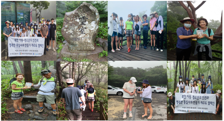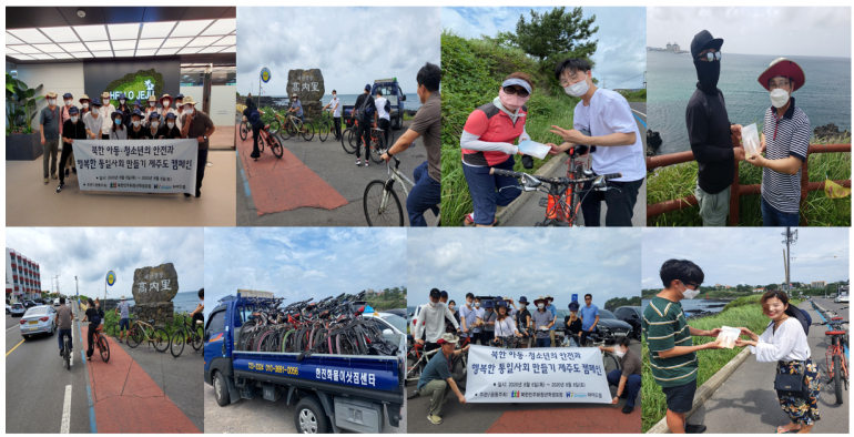 북한민주화청년학생포럼(대표 : 박광일)은 하이드림(대표 : 유진의)과 공동으로 지난 2020년 8월 6일(목요일)부터 8월 8일(토요일)까지 남과 북의 청년대학생들이 함께 하는 '북한 아동, 청소년 인권과 행복한 통일사회 만들기 전국 순회 캠페인' 의 첫 일정으로 제주도캠페인 을 진행하였습니다. 이번 캠페인의 첫 일정은 제주시 애월읍의 해안도로에서 자전거를 타고 다니며 제주시민들에게 북한 아동, 청소년의 인권과 한반도 통일을 주제로 한 소책자. DVD를 나눠주는 홍보활동을 진행했습니다. 두번째 일정으로는 한라산을 등반하면서 등산객들에게 북한 아동, 청소년의 인권과 한반도 통일을 주제로 한 소책자. DVD 등 홍보물을 전해주고 북한 인권과 통일에 대해 설명하는 홍보활동을 진행했습니다.